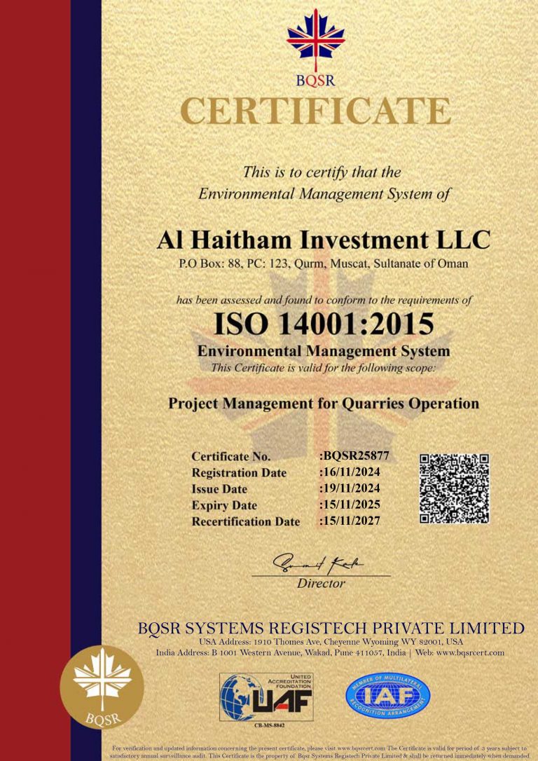 We are highly conscious of the implementation and maintenance of control measures necessary to meet all requirements outlined in ISO 14001:2015. Al Haitham continually works to improve our environmental policies, striving to minimize our environmental impact while protecting the surroundings of our operation area.