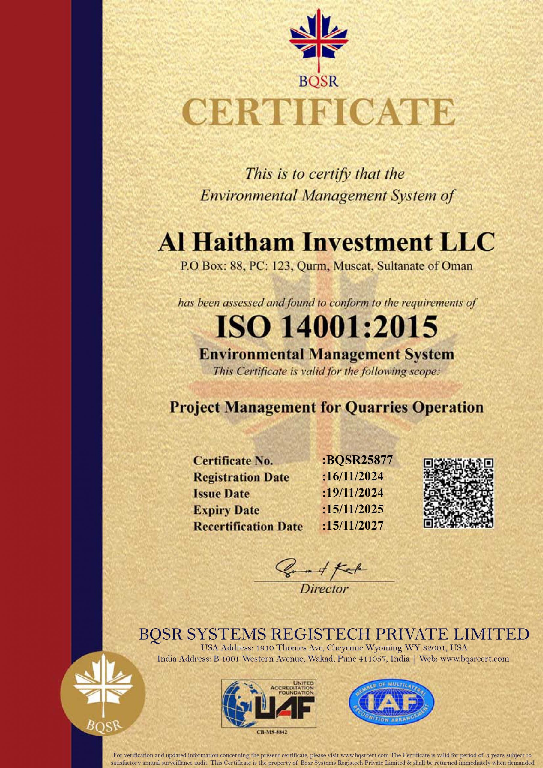 Al Haitham is deeply committed to protecting the environment in and around its operational premises. Our dedication to environmental responsibility is exemplified by our ISO 14001:2015 certification, which specifies the requirements for an effective environmental management system aimed at enhancing environmental performance.
